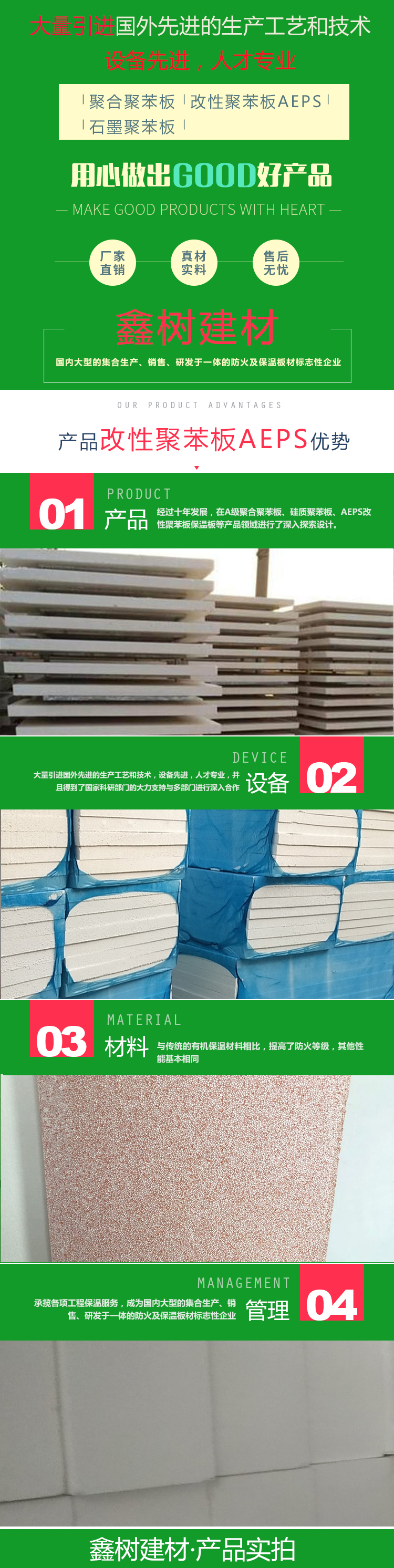 菏澤市定陶區鑫樹建材有限公司經過十年發展,在A級聚合聚苯板、硅質聚苯板、AEPS改性聚苯板保溫板等產品領域進行了深入探索,并且大量引進國外先進的生產工藝和技術,設備先進,人才專業,并且得到了國家科研部門的大力支持與多部門進行深入合作,承攬各項工程保溫服務,成為國內大型的集合生產、銷售、研發于一體的防火及保溫板材標志性企業。