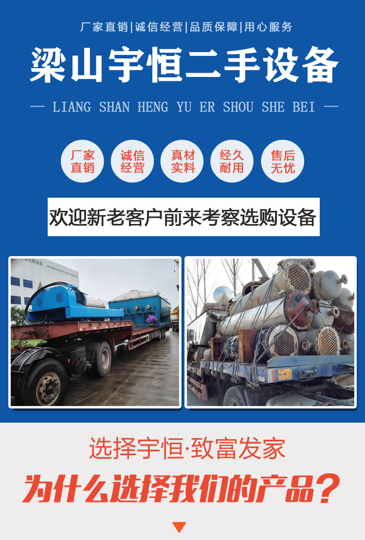 梁山宇恒二手設(shè)備有限公司所售產(chǎn)品現(xiàn)貨供應(yīng),貨源充足,規(guī)格齊全,業(yè)務(wù)遍及全國各地。多年來,本公司始終堅持“信譽為本,客戶至上,以誠相待,薄利多銷”的經(jīng)營宗旨,產(chǎn)品銷往國內(nèi)二十七省市。公司對所售設(shè)備重質(zhì)量講信譽,價格合理、免費運輸、跟蹤服務(wù)、貨到付款,并可對無技術(shù)的客戶提供工程技術(shù)人員,從項目的設(shè)計、安裝、調(diào)試、確保所售設(shè)備正常使用。免去用戶對舊設(shè)備的一切后顧之憂。我們將以好的產(chǎn)品,優(yōu)的服務(wù),可靠的信譽,優(yōu)惠的價格為您事業(yè)成功助一臂之力,經(jīng)理攜全體員工竭誠歡迎新老客戶前來考察選購設(shè)備。