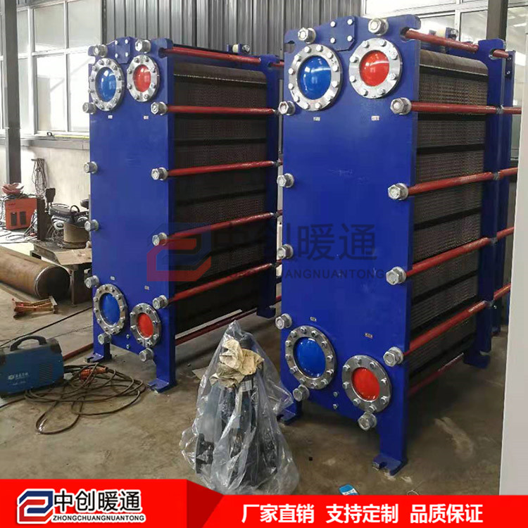 ?板式換熱器是由傳熱板片、密封膠墊、框架和夾緊螺栓等主要零部件組成。是用薄金屬制成具有一定形狀波紋的換熱板片,然后疊裝而成達(dá)到一種換熱器,工作流體在兩塊板片所形成的窄而曲折的通道中流過,冷熱流體依次通過各個(gè)流道,中間隔一層板片,通過此板片進(jìn)行換熱。傳熱板片四個(gè)角開有角孔,鑲貼有密封膠墊的傳熱板片安裝在固定夾緊板和活動(dòng)夾緊板之間的框架上,用夾緊螺栓夾緊。傳熱板片波紋為人字形,相鄰板片具有反方向的人字形溝槽,溝槽的交叉點(diǎn)相互支撐形成接觸點(diǎn),介質(zhì)流動(dòng)時(shí)形成湍流,從而獲得很高的傳熱效率。