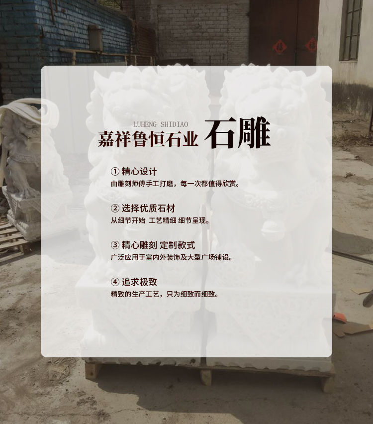 嘉祥魯恒石業有限公司具有圓雕、透雕、線雕、浮雕等多種工藝,可為城市機關、企業、公園、旅游景點、古城古建等部門提供各種適應的石雕藝術品。均采用優良天青石、漢白玉、砂巖、大理石、花崗石、雪花白等石材雕刻成各種世術用品和擺件。例如、歷史人物、神像、花鳥、走獸、香爐、石亭、石塔、石橋、石牌坊、龍柱、燈籠、浮雕、欄桿、石獅、園藝、石桌、石椅、石凳等,可謂琳瑯滿目,品種繁多。產品經過長期開發、創新,現已形成十大系列,一千多個品種,即保持了傳統的藝術風格,又富有現代藝術風韻,在全國工藝品行業獨樹一幟暢銷全國各地和東亞各國。