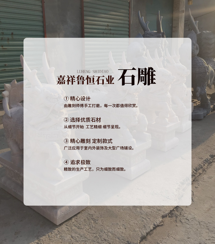 嘉祥魯恒石業有限公司具有圓雕、透雕、線雕、浮雕等多種工藝,可為城市機關、企業、公園、旅游景點、古城古建等部門提供各種適應的石雕藝術品。均采用優良天青石、漢白玉、砂巖、大理石、花崗石、雪花白等石材雕刻成各種世術用品和擺件。例如、歷史人物、神像、花鳥、走獸、香爐、石亭、石塔、石橋、石牌坊、龍柱、燈籠、浮雕、欄桿、石獅、園藝、石桌、石椅、石凳等,可謂琳瑯滿目,品種繁多。產品經過長期開發、創新,現已形成十大系列,一千多個品種,即保持了傳統的藝術風格,又富有現代藝術風韻,在全國工藝品行業獨樹一幟暢銷全國各地和東亞各國。
